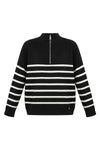 Deze gebreide trui met strepen en rits combineert warmte en stijl — een must-have voor de herfst en winter. Perfect te dragen met een leren legging of pantalon voor een moeiteloze, trendy look. Verkrijgbaar in meerdere kleuren.