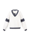 Sportieve V-hals trui met een opvallende kleurenclash, ideaal voor herfst en winter. Combineer gemakkelijk met jeans of casual broeken voor een trendy look. Verkrijgbaar in S/M en L/XL.